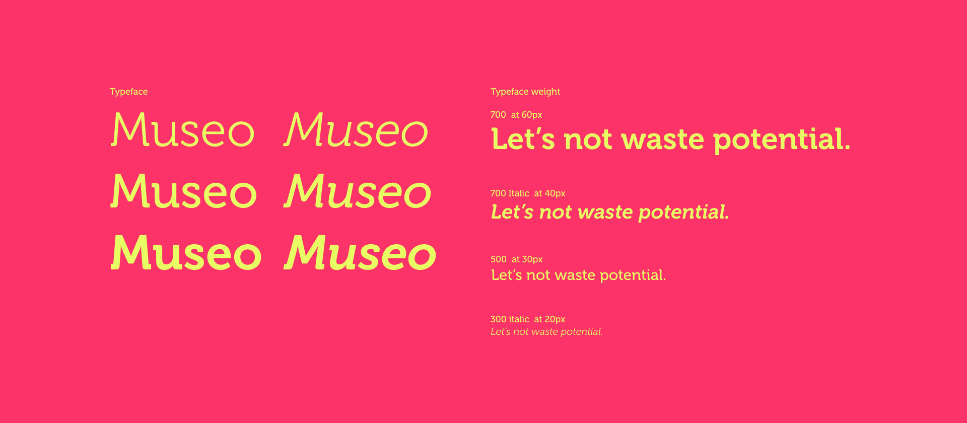 The hierarchy in Redo's text is crucial for highlighting the importance of its content. Ensure a clear distinction between different text sizes to make the hierarchy easy to visually understand. Using as few sizes and formatting options as possible – never more than two weights and more than four sizes within the same layout. Redo's main weights here are Museo 300, 700, and Italic 300, which are used only to highlight detailed text.