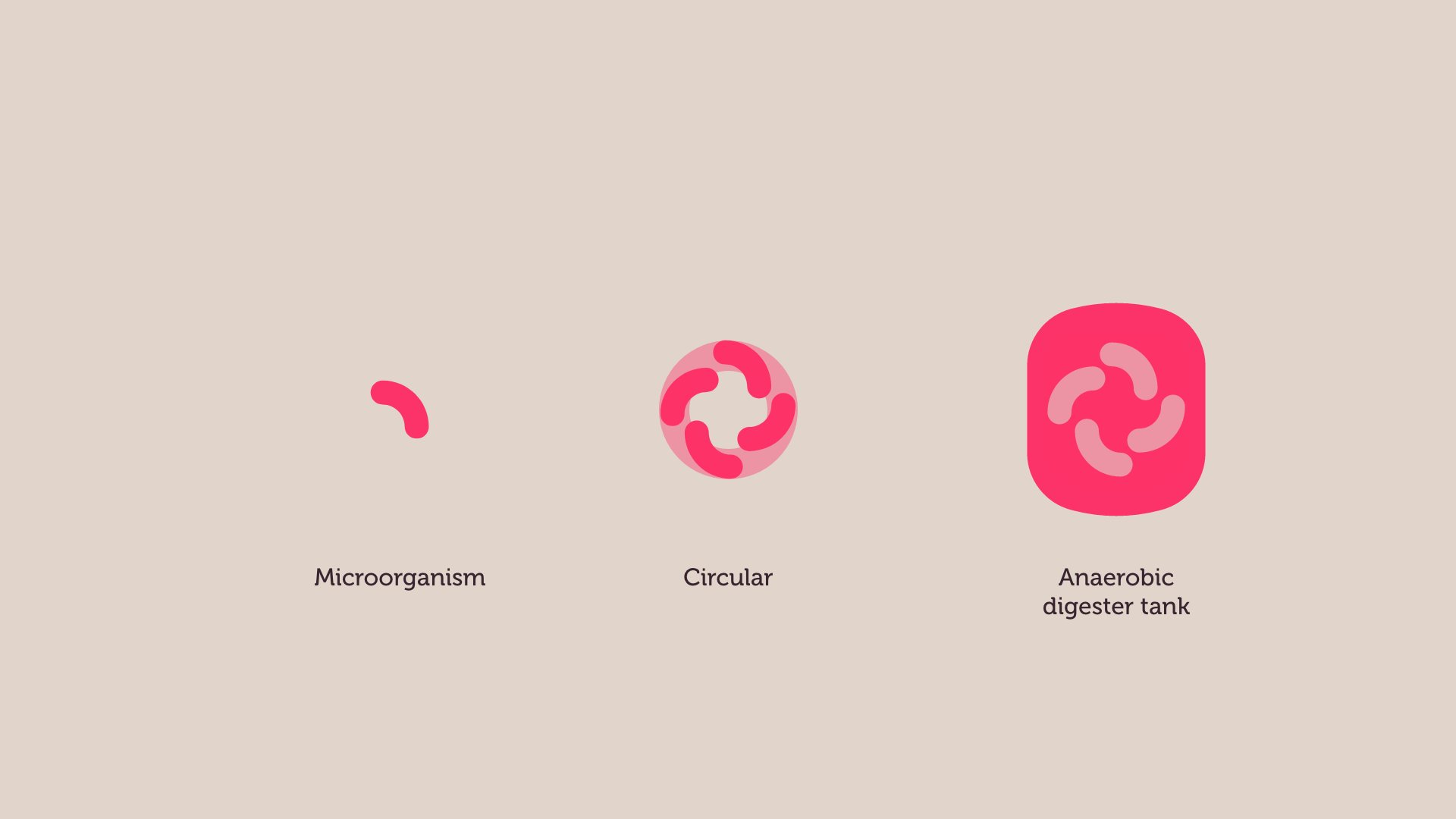 The symbol highlights the renewable cycle by emphasizing the role of microorganisms and their processes, circularity and the process of Anaerobic Digestion in a tank.